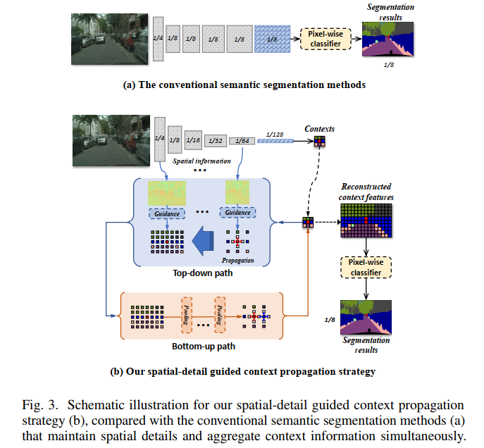上下文传播(context propagation)应该满足两个要求: 1)在上下文传播期间,上下文信息应该与相邻像素中包含的空间细节一致; 2)在上下文传播之后,可以尽可能多地恢复原始的全局上下文。 因此, 空间细节上下文传播策略通过构建一个双向传输通道来实现,分别称之为自顶向下路径和自底向上路径。