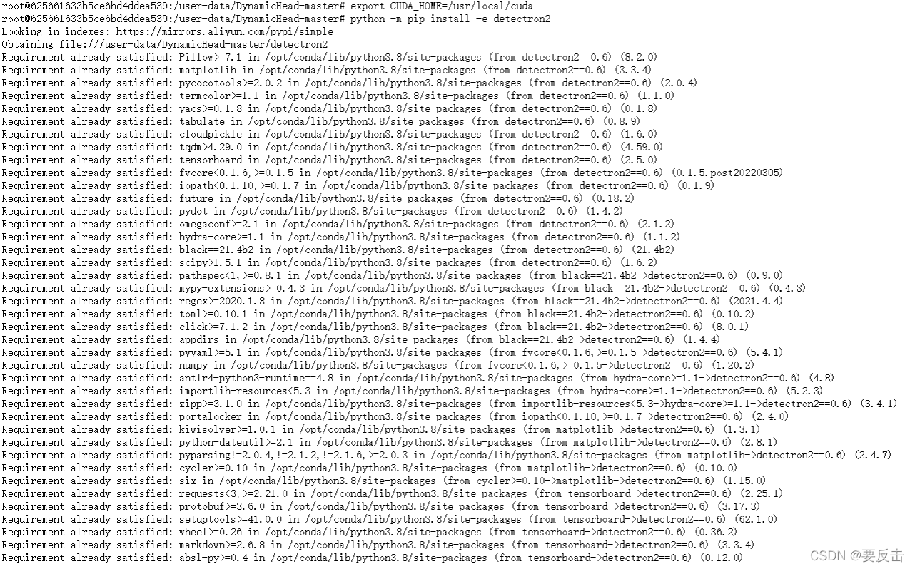 Installing collected packages: detectron2 ? Running setup.py develop for detectron2 ? ? ERROR: Command errored out with exit status 1: ? ? ?command: /opt/conda/bin/python -c 'import io, os, sys, setuptools, tokenize; sys.argv[0] = '"'"'/user-data/DynamicHead-master/detectron2/setup.py'"'"'; __file__='"'"'/user-data/DynamicHead-master/detectron2/setup.py'"'"';f = getattr(tokenize, '"'"'open'"'"', open)(__file__) if os.path.exists(__file__) else io.StringIO('"'"'from setuptools import setup; setup()'"'"');code = f.read().replace('"'"'\r\n'"'"', '"'"'\n'"'"');f.close();exec(compile(code, __file__, '"'"'exec'"'"'))' develop --no-deps ? ? ? ? ?cwd: /user-data/DynamicHead-master/detectron2/ ? ? Complete output (17 lines): ? ? running develop ? ? running egg_info ? ? writing detectron2.egg-info/PKG-INFO ? ? writing dependency_links to detectron2.egg-info/dependency_links.txt ? ? writing requirements to detectron2.egg-info/requires.txt ? ? writing top-level names to detectron2.egg-info/top_level.txt ? ? reading manifest file 'detectron2.egg-info/SOURCES.txt' ? ? adding license file 'LICENSE' ? ? writing manifest file 'detectron2.egg-info/SOURCES.txt' ? ? running build_ext ? ? /opt/conda/lib/python3.8/site-packages/setuptools/command/easy_install.py:144: EasyInstallDeprecationWarning: easy_install command is deprecated. Use build and pip and other standards-based tools. ? ? ? warnings.warn( ? ? /opt/conda/lib/python3.8/site-packages/setuptools/command/install.py:34: SetuptoolsDeprecationWarning: setup.py install is deprecated. Use build and pip and other standards-based tools. ? ? ? warnings.warn( ? ? /opt/conda/lib/python3.8/site-packages/pkg_resources/__init__.py:123: PkgResourcesDeprecationWarning: 4.0.0-unsupported is an invalid version and will not be supported in a future release ? ? ? warnings.warn( ? ? error: [Errno 2] No such file or directory: "'/usr/local/cuda'/bin/nvcc" ? ? ---------------------------------------- ERROR: Command errored out with exit status 1: /opt/conda/bin/python -c 'import io, os, sys, setuptools, tokenize; sys.argv[0] = '"'"'/user-data/DynamicHead-master/detectron2/setup.py'"'"'; __file__='"'"'/user-data/DynamicHead-master/detectron2/setup.py'"'"';f = getattr(tokenize, '"'"'open'"'"', open)(__file__) if os.path.exists(__file__) else io.StringIO('"'"'from setuptools import setup; setup()'"'"');code = f.read().replace('"'"'\r\n'"'"', '"'"'\n'"'"');f.close();exec(compile(code, __file__, '"'"'exec'"'"'))' develop --no-deps Check the logs for full command output.
