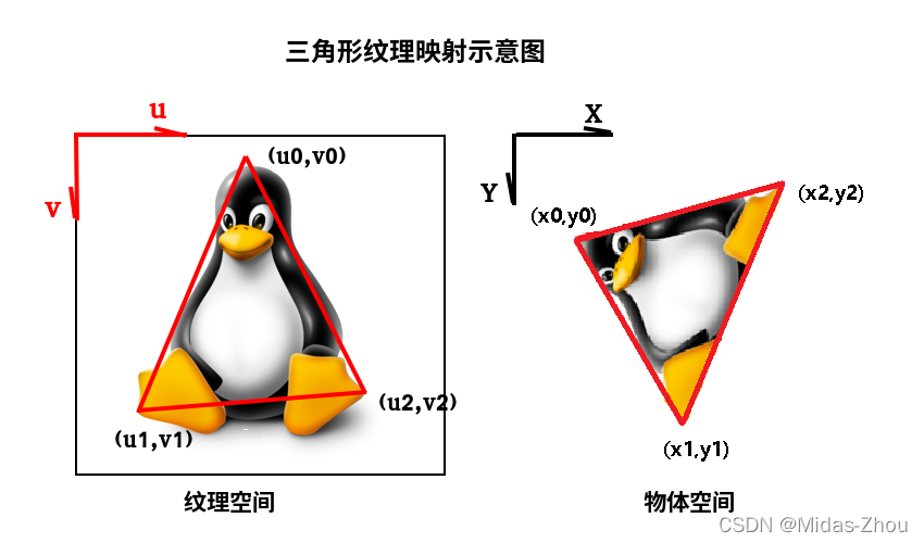 ?如上图,已知物体空间中三角形的顶点坐标(x0,y0),(x1,y1),(x2,y2)分别对应到纹理空间坐标(u0,v0),(u1,v1),(u2,v2).?将他们的坐标值组合成3阶矩阵 matXYZ={ x0,y0,z0; x1,y1,z1; x2,y2,z2 } 和 matUV={ u0,v0,1.0; u1,v1,1.0; u2,v2,1.0 } 假设存在一个变换矩阵T, 使得下面等式成立: ???? matUV = matXYZ * matT? ? 如果matT有解, 那么可以得到: ???? matT = matIXYZ * matUV? (这里matIXYZ是matXYZ的逆阵) 矩阵matT就是从物体空间到纹理空间的映射变换矩阵. 一旦求出了matT, 那么物体空间三角形内的每一个像素点都可以映射到纹理空间中,并得到对应位置处的颜色值. 我们可以历遍物体空间三角形内的每一个像素点, 通过映射变换逐点上色, 最终得到完整的图像.