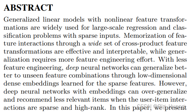 ????????WideDeep 模型是Google在2016年提出的,在业界具有非常大的影响力,模型由单层Wide部分和多层的Deep部分组成的混合模型。Wide 体现 “记忆能力” 主要是模型直接学习并利用历史数据中物品或者特征的“共现频率”能力。而Deep部分体现 “ 泛化能力 ” 主要是根据特征发掘甚至从未出现过的稀有特征与最终标签相关性的能力。? 再简单理解就是Wide部分采用简单的线性回归模型,直接发掘了历史数据的分布规则,例如针对成对出现的特征; 而Deep部分则是通过深层的神经网络发掘数据中潜在的关系。