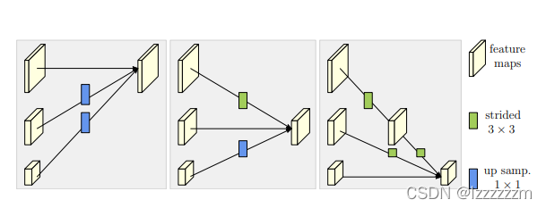 对于高层特征图向低层进行融合,则是将高层特征图上采样到和低层图一样的尺寸,然后进行相加拼接。对于低层特征向高层特征进行融合,则是通过经过一个3x3,stride为2的卷积进行下采样,达到和高层同样维度进行拼接。