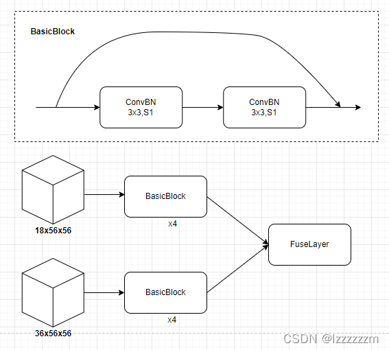 在进行不同层次特征图分裂及融合前,每个层次都需要经过一系列的block结构,来增强每层特征图提取特征的能力,具体block结构,其实就是resnet中的BasicBlock。这里以第一个分支之后只有两个分支特征图举例。