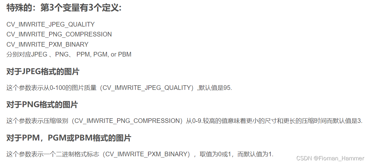 filename: 要保存的文件名img: 一般填入一个Mat类型的图像数据params: 标识为特定格式保存的参数编码,它有一个默认值std::vector(),所以一般情况下不用写.如果要填写.如果要更改的话,对于不同的图片格式,其对应的值不同功能不同,如下: