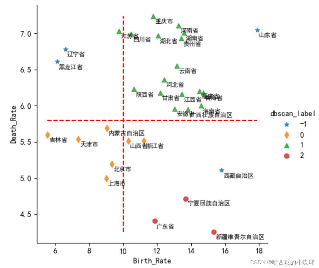 ?如左图所示,三角形、菱形和圆形所代表的点即为三个不同的簇,五角星所代表的点即为异常点,这个聚类效果还是非常不错的,对比建模之前的结论非常吻合。从上图可知,以北京、天津、上海为代表的省份,属于低出生率和低死亡率类型;广东、宁夏和新疆三个省份属于高出生率和低死亡率类型;江苏、四川、湖北为代表的省份属于高出生率和高死亡率类型。四个异常点中,黑龙江与辽宁比较相似,属于低出生率和高死亡率类型;山东省属于极高出生率和高死亡率的省份;西藏属于高出生率和低死亡率的省份,但它与广东、宁夏和新疆更为相似。