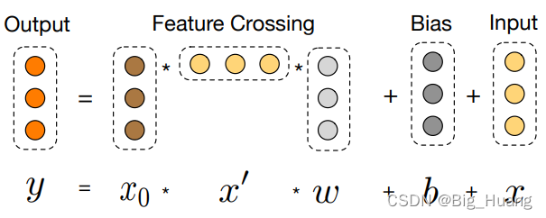????????争对 Cross Network部分 , 论文中给出的单层计算过程如下, 可以看出主要有 首先是个?叉乘操作,叉乘的对象是 x_0 和 当前 x 的转置, 其次有一个类似 线性层的计算,最后再加上当前 x。 直观上可以看到? 首先叉乘操作类似做了一个相关性的计算,相较于?WideDeep 仅仅是一个线性回归层,这里使用相关性计算( 是不是可以理解为注意力机制?),做了特征交叉,能够一定程度上更好的利用特征;但是仔细看又能发现每一层的参数个数仅仅只有 2 * feature_nums,单次计算的输入输出维度相同,可以支持多层叠加运算(论文中implementation details 也说到 Cross 层 取1 to 6),线性回归的参数量比这个可大得多的多了,参数量少也就限制了模型的表达能力,所以作者由加了另一个 Deep 部分获得更高的非线性相互作用。