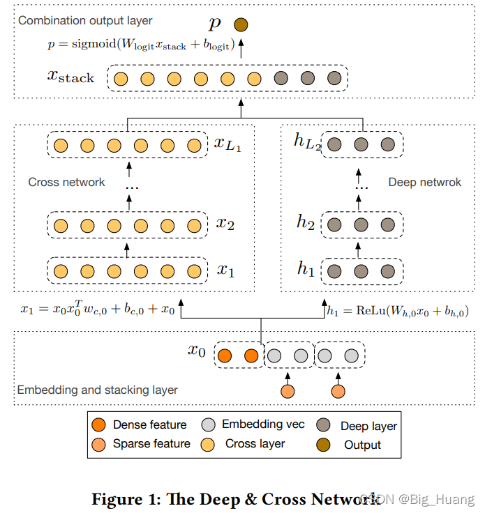 ????????DeepCross模型整体内容思想是和WideDeep保持一致的, 尤其是Deep部分基本一致, 但是将原先单线性回归的Wide部分替换为Cross网络,增加特征之间的交互力度.? 模型结构如上图所示, DCN(论文中的叫法)模型从Embedding和Stacking层开始,然后是并行的Cross网络和Deep网络,最后是将两个网络的输出组合在一起的Stacking层和输出层。图示很清楚的表明了模型结构, 配合原论文 第二章一起食用更佳~~~ Embedding、Stacking、Deep、以及输出在其它网络中已经很常见了。