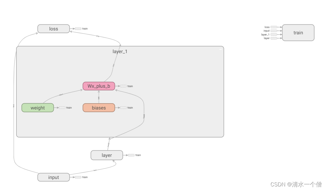 这里使用tensorflow方法就是with tf.name_scope(),例如我们要在tensorboard中显示一个layer,这一层中包含着权重和偏差,这时代码可以设计为: