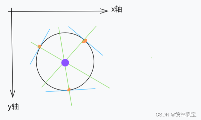 其中蓝色部分就是该点的梯度,也就是点在圆上的切线。 做切线的垂直方向直线,得到如下所示:  其中紫色的点,即为法线的交点。