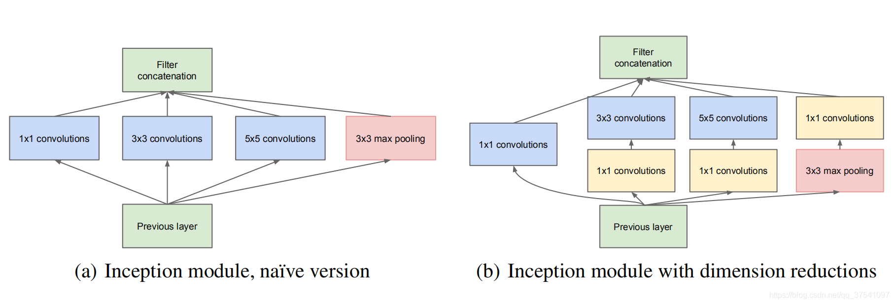 左图呢,是论文中提出的inception原始结构,右图是inception加上降维功能的结构。