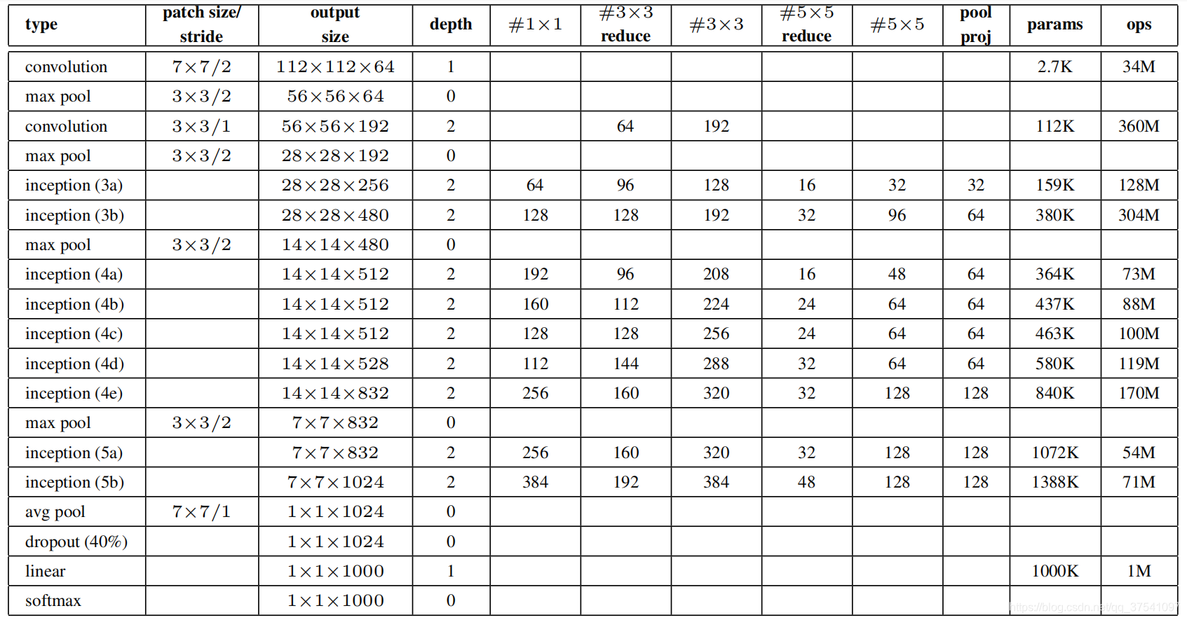 ?每个卷积层的卷积核个数如何确定呢,下面是原论文中给出的参数列表,对于我们搭建的Inception模块,所需要使用到参数有#1x1, #3x3reduce, #3x3, #5x5reduce, #5x5, poolproj,这6个参数,分别对应着所使用的卷积核个数。