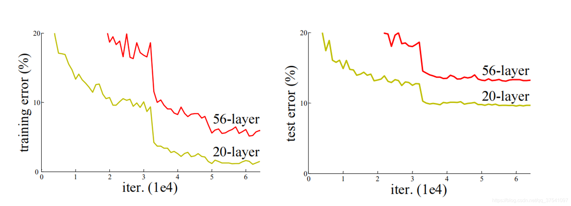 在ResNet网络提出之前,传统的卷积神经网络都是通过将一系列卷积层与下采样层进行堆叠得到的。但是当堆叠到一定网络深度时,就会出现两个问题。1)梯度消失或梯度爆炸。 2)退化问题(degradation problem)。在ResNet论文中说通过数据的预处理以及在网络中使用BN(Batch Normalization)层能够解决梯度消失或者梯度爆炸问题。如果不了解BN层可参考这个链接。但是对于退化问题(随着网络层数的加深,效果还会变差,如下图所示)并没有很好的解决办法。