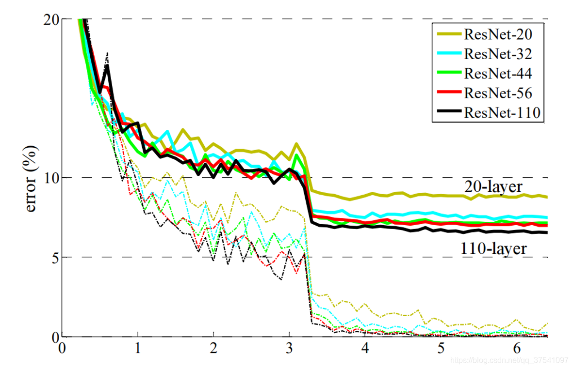 ?所以ResNet论文提出了residual结构(残差结构)来减轻退化问题。下图是使用residual结构的卷积网络,可以看到随着网络的不断加深,效果并没有变差,反而变的更好了。