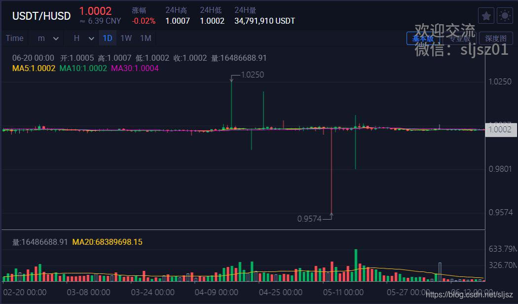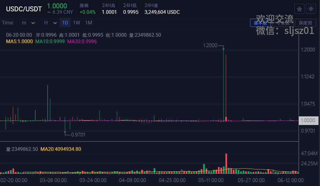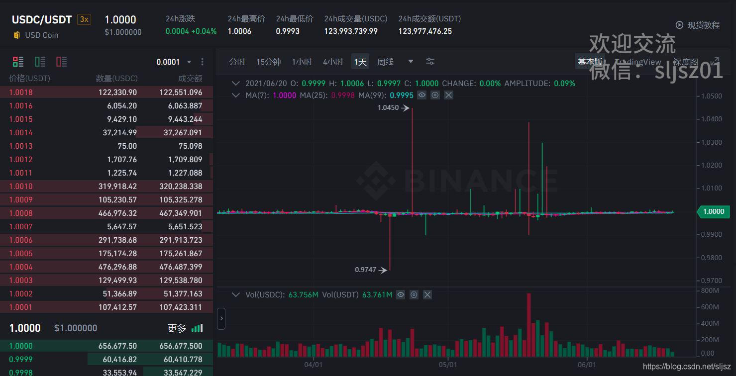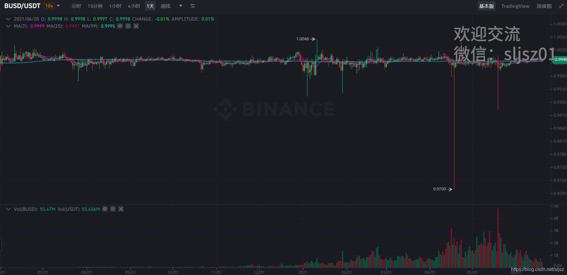 首先,稳定币对不稳定,日常波动率带来的机会很丰富。在很多人的直观印象中,稳定币对应该是长期不怎么波动的,在实际情况并非如此,稳定币的日常波动率就不小,足够我们做交易了。比如我们截取的最近一段BUSD/USDT对的行情,可以看到,最低到过0.9883,而最高到1.0013,中间有超过1.3%的振幅。足以说明,稳定币对,并不稳定。
