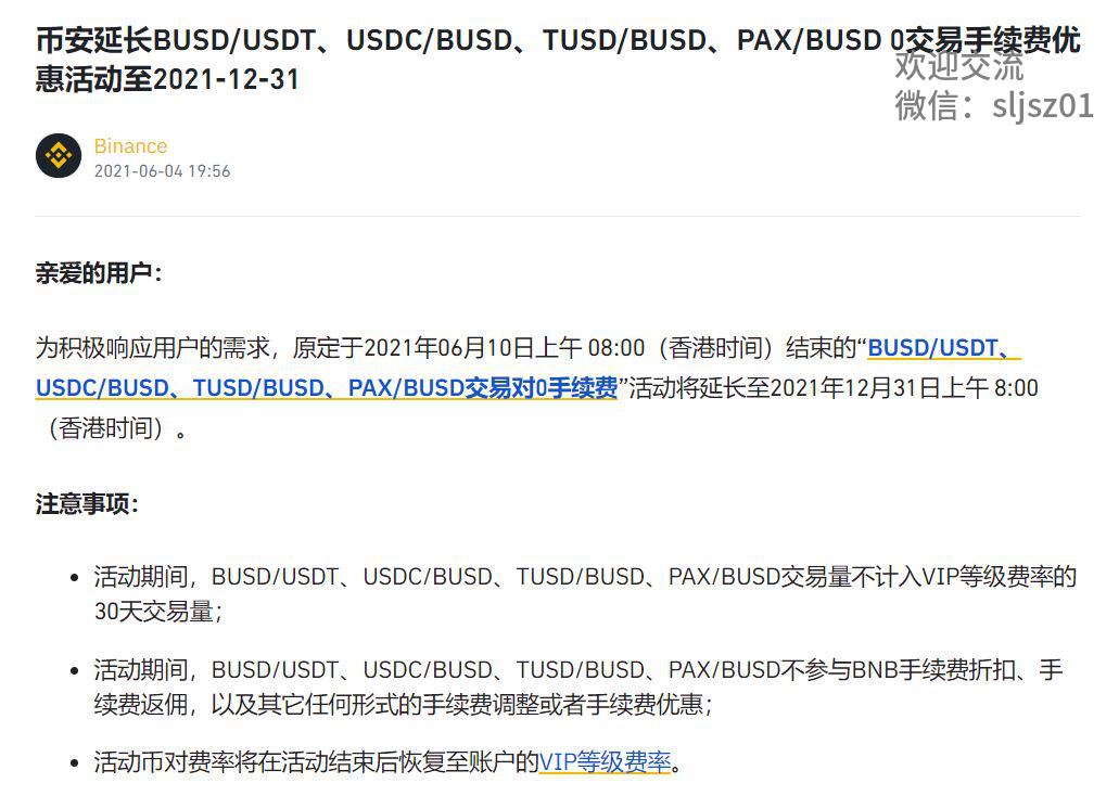 币安部分稳定币对:交易零手续费 在币安交易所交易稳定币对,相比较其他交易所,还有一个显著的优势,币安对于BUSD/USDT、USDC/BUSD、TUSD/BUSD等货币对采用0交易手续费。  我们知道,交易手续费是高频交易的天敌,频率越高,手续费也越高,而币安对于稳定币对的0交易手续费,为我们的高频网格做市策略,提供了最好的环境。从币安手续费的延续来看,零费率的优惠活动已经多次延期,这一次即使到年底,也大概率会延期。