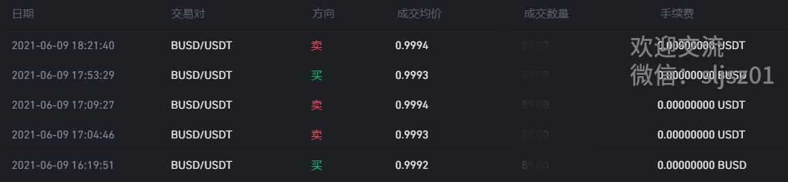 最后,一起来看一下,我们的程序在币安稳定币对BUSD/USDT上的一些交易记录(每一笔交易手续费都是0)。