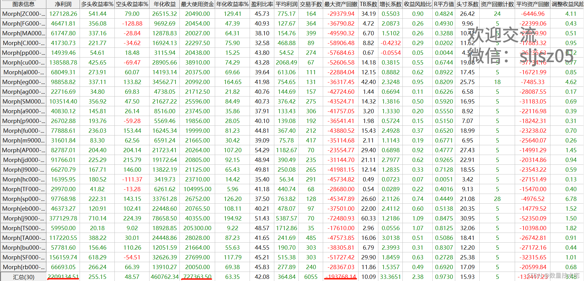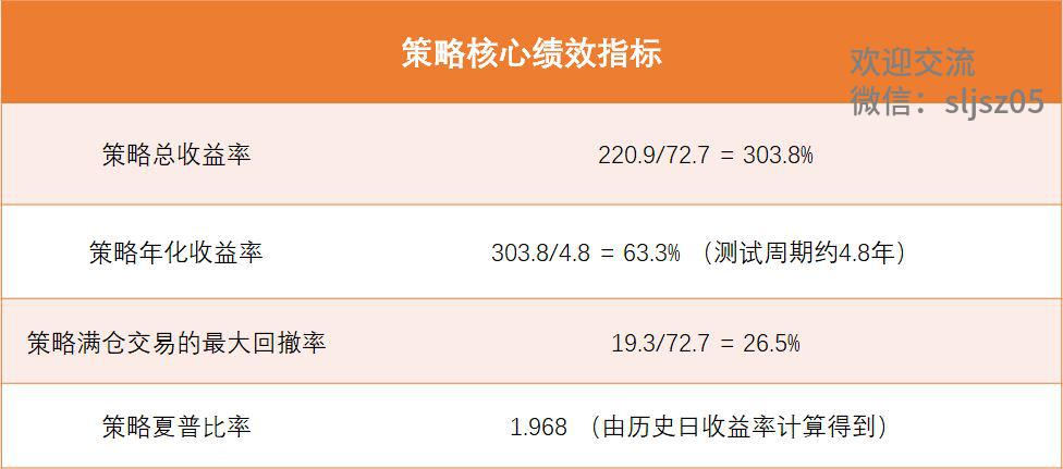 ?再一起看上图最后一行汇总的红色划线部分,总盈利220.9万,最大使用资金72.7万,最大回撤19.3万。由这几个数据可以计算出策略的核心绩效指标: