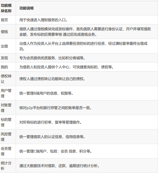 | 1 | 用户层 | 用户层描述了本系统所支持的用户类型包括:pc用户、app用户、h5用户。pc用户通过浏览器访问系统、app用户通过android、ios手机访问系统,H5用户通过h5页面访问系统。 | | 2 | CDN | CDN全称Content Delivery Network,即内容分发网络,本系统所有静态资源全部通过CDN加速来提高访问速度。系统静态资源包括:html页面、js文件、css文件、image图片、pdf和ppt及doc教学文档、video视频等。 | | 3 | 负载均衡 | 系统的CDN层、UI层、服务层及数据层均设置了负载均衡服务,上图仅在UI层前边标注了负载均衡。 每一层的负载均衡会根据系统的需求来确定负载均衡器的类型,系统支持4层负载均衡+7层负载均衡结合的方式,4层负载均衡是指在网络传输层进行流程转发,根据IP和端口进行转发,7层负载均衡完成HTTP协议负载均衡及反向代理的功能,根据url进行请求转发。 | | 4 | UI层 | UI层描述了系统向pc用户、app用户、h5用户提供的产品界面。根据系统功能模块特点确定了UI层包括如下产品界面类型: 1)面向C端用户的万信金融交易平台。 2)面向B端服务的万信金融业务支撑系统。 | | 5 | 微服务层 | 微服务层将系统服务分类两类:业务微服务、基础微服务。 业务微服务:主要为C端和B端服务提供业务服务,包括统一认证、交易中心、还款服务等。 基础微服务:为系统级的公共服务,不涉及具体的业务,包括文件服务、配置服务、调度服务等。 | | 6 | 数据层 | 数据层描述了系统的数据存储的内容类型,持久化的业务数据使用MySQL。消息队列:存储系统服务间通信的消息,本身提供消息存取服务,与微服务层的系统服务连接。 索引库:存储标的信息的索引信息,本身提供索引维护及搜索的服务,与微服务层的系统服务连接。 缓存:作为系统的缓存服务,存储标的信息、验证码信息、用户信息等,与微服务层的所有服务连接。 文件存储:提供系统静态资源文件的分布式存储服务,文件存储服务器作为CDN服务器的数据来源,CDN上的静态资源将最终在文件存储服务器上保存多份。 | | 7 | 外部系统接口 | 1)银行存管系统接口,借钱、出借交易全部通过银行存管系统存储订单信息。 2)支付宝、微信、网银支付接口,本系统提供支付宝、微信、网银三种支付接口。 3)短信接口,本系统与第三方平台对接短信发送接口。 4)邮件接口,本系统需要连接第三方的smpt邮件服务器对外发送电子邮件。 5)文件存储 ,静态资源文件的存储采用第三方文件服务方式,本系统初期采用七牛云文件存储 6)CDN,本系统与第三方CDN服务对接,使用CDN加速服务来提高本系统的访问速度。 | | 8 | 银行存管系统 | 目前国家主张采用“银行存管模式”来规避P2P平台挪用借投人资金的风险,通过银行开发的“银行存管系统”管理投资者的资金,每位P2P平台用户在银行的存管系统内都会有一个独立账号,P2P平台来管理交易,做到资金和交易分开。P2P平台需要与银行存管系统接口,存储借款人和投资人之间的交易信息。 | | 9 | DevOps | DevOps(英文Development和Operations的组合)是一组过程、方法与系统的统称,用于促进开发(应用程序/软件工程)、技术运营和质量保障(QA)部门之间的沟通、协作与整合。本项目供了许多开发、运营、维护支撑的系统,包括: Eureka服务治理中心:提供服务治理服务,包括:服务注册、服务获取等。 Spring Cloud Config服务配置管理中心:提供服务配置管理服务,包括:配置文件更新、配置文件下发等。 Hystrix Dashboard服务熔断监控:监控熔断的请求响应时间、成功率等 。Zipkin服务追踪监控:监控服务调用链路健康情况。 Jenkins持续集成服务:提供系统持续集成服务。Git/GitLab代码管理服务:提供git代码管理服务。 ELK日志分析服务:提供elk日分析服务,包括系统运行日志分析、告警服务。 Docker容器化部署服务:将本系统所有服务采用容器化部署方式。 Maven项目管理工具:提供管理项目所有的Java包依赖、项目工程打包服务。 |