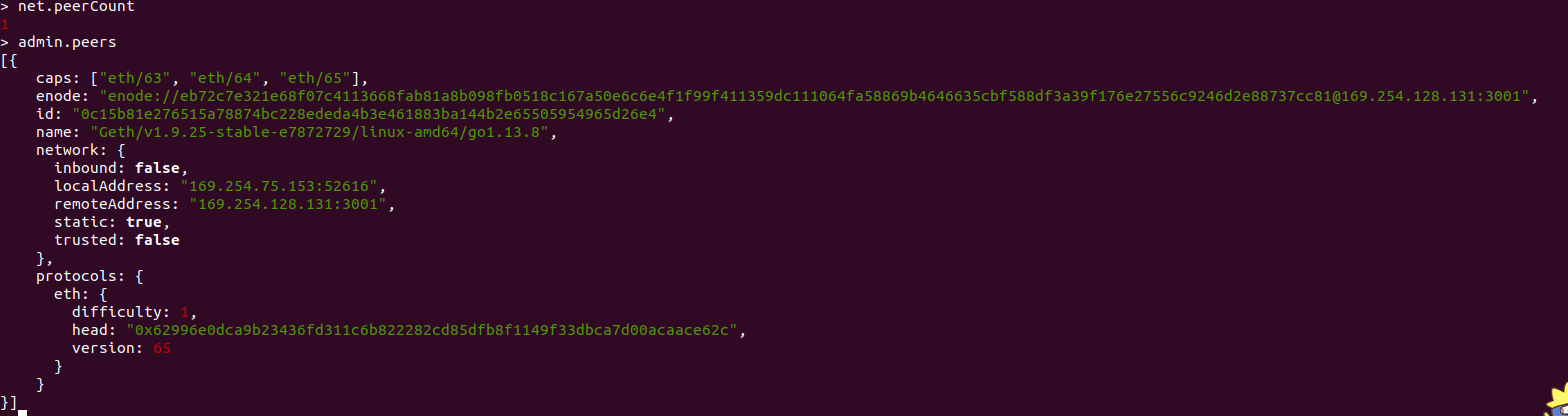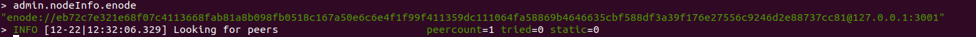 admin.addPeer("enode://eb72c7e321e68f07c4113668fab81a8b098fb0518c167a50e6c6e4f1f99f411359dc111064fa58869b4646635cbf588df3a39f176e27556c9246d2e88737cc81@169.254.128.131:3001")