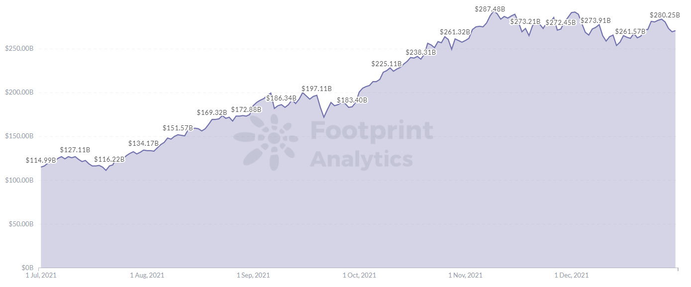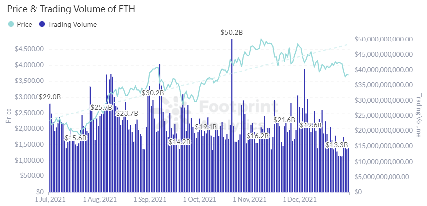 Footprint Analytics?数据显示,12 月份 BTC 的价格从 57,179 美元跌至 46,472 美元,跌幅为 23%,月内最高日交易量为 577 亿美元,截至 12 月 31 日,BTC 的 Market Cap 为 8.8 万亿美元 。ETH 的价格从 4,592.82 美元跌至 3,695.60 美元,下跌 24.2%,月内最高日交易量为 403 亿美元,截至 12 月 31 日,ETH 的 Market Cap 为 4.4 万亿美元 。