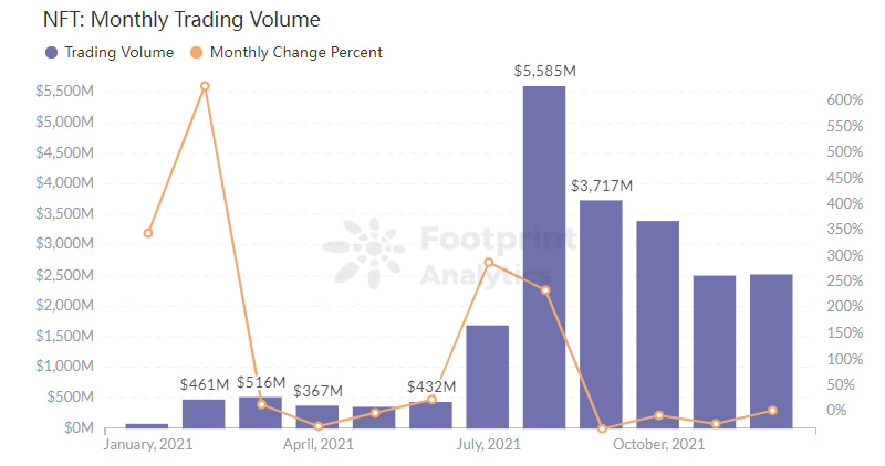 自 7 月以来 NFT 赛道成为加密市场的黄金赛道,交易频繁,出现了不少的天价 NFT。然而从 NFT 每月的交易量变化来看,仅 7-8 月这一阶段是交易增量期,8 月以后逐渐下降。这个变化过程颇有“新事物出现吸引了大量看客围观,看后潇洒离去,留下 ‘志在此’ 的那一部分人”的意味。而逐渐历经冷静期的 NFT 市场,在 12 月迎来了 0.78% 的交易量正增长,达到 25.1 亿美元。