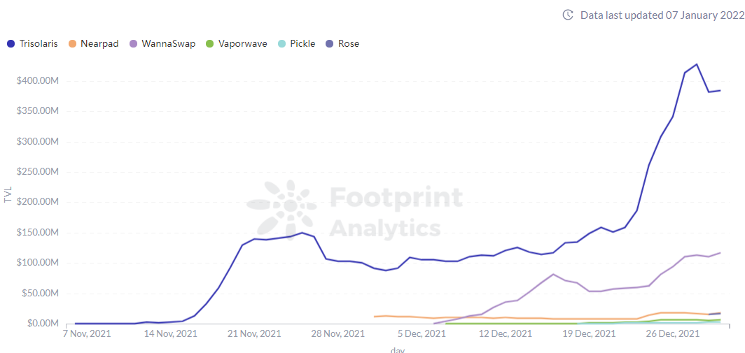 除了主流大公链外,过去 31 天内的 TVL 增长最快的是 Aurora,TVL 从 1 亿美元升了 456.88% 至 5.9 亿美元,增幅主要由 Trisolaris 助力。Trisolaris 是 NEAR 生态中的去中心化交易所,部署在 Aurora 链上。值得一提的是此前 NEAR 曾宣布推出 8 亿美元生态基金,其中的 3.5 亿美元专注于 DeFi 业务的发展。