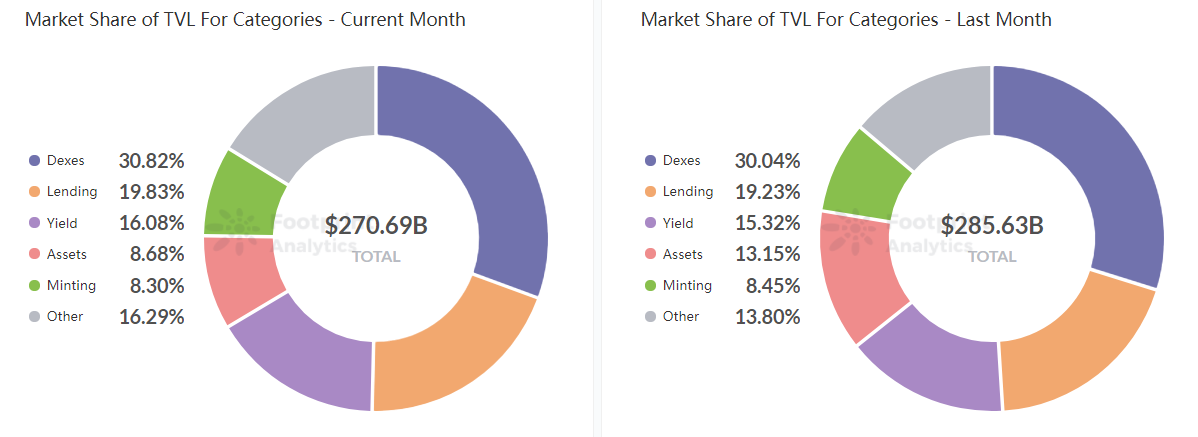 12 月,受到加密货币市场的颓势影响,从?Footprint Analytics?的数据可看到, Assets 板块降幅最大,环比下降 60%; Layer2?和 跨链桥 TVLBridge 不降反增,增幅分别是 3,510.54% 和 270.44%,因 TVL 占比不高,从而在总量上对整个 DeFi TVL的增幅助力不大。截止 12 月 31 日,DeFi 的 TVL 为 ?2,706.9 亿美元,环比下降 5.23%。