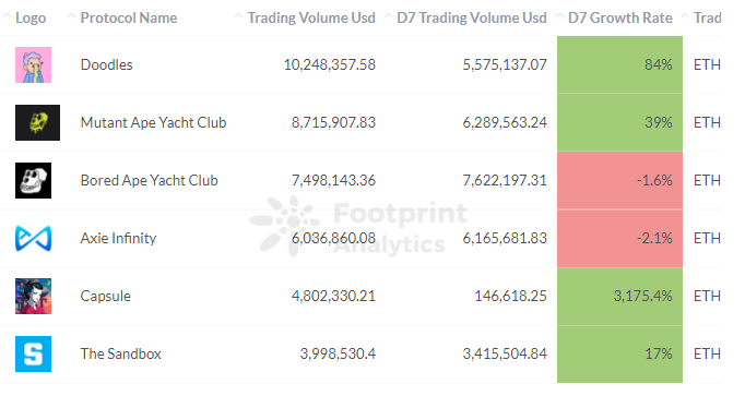 增量主要受到以太坊上的一些收藏品以及元宇宙虚拟土地销售的影响。从?Footprint Analytics?过去 7 天 NFT 交易量来看,公开发售而吸引大批用户的 Doodles 增幅 84%,变异无聊猿 Mutant Ape Yacht Club 增幅 39%,虚拟地块 The Sandbox?增幅 17%。值得注意的是 Capsule 涨了 3,014.86% 而以 480 万美元升至第五位。