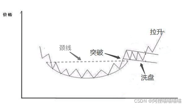 - 圆弧底:圆弧底属于一种底部反转形态,是极弱势行情的典型特征。其形态表现在K线图中宛如锅底状。以圆弧中两边的最高点为参照,画一条水平直线。称为颈线。