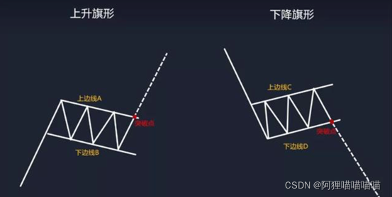 - 旗形,就是市场走势像一面挂在旗杆顶上的旗帜。这类形态通常在市场急速剧烈波动的时候出现。旗形可分为上升旗形、下降旗形,有时候还会出现尖旗形。