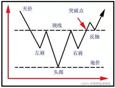 - 头肩底:头肩底是一种典型的趋势反转形态,是在行情下跌尾声中出现的看涨形态,图形以左肩、底、右肩及颈线形成;头肩底是判断市场重要底部形成的最常见K线形态之一。