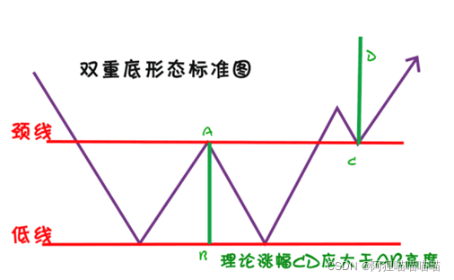 - W底:W底也称"双重底",是技术形态中常见的一种底部形态,W底是指币价在连续二次下跌的低点大致相同时形成的行情走势图。其颈线位置是第一次反抽形成的凸点所画的一条水平直线,两个跌至最低点的连线叫低线/支撑线。