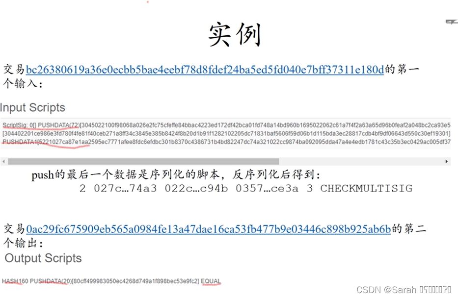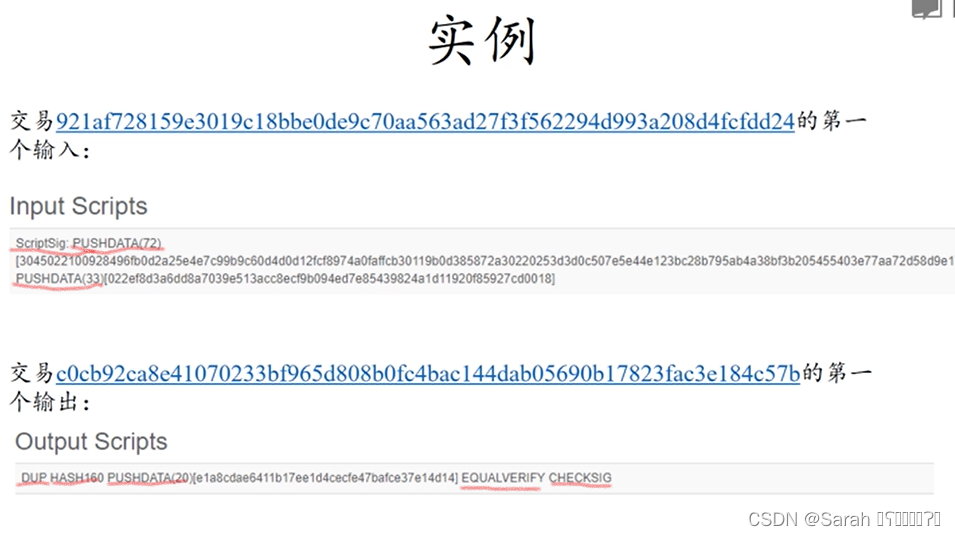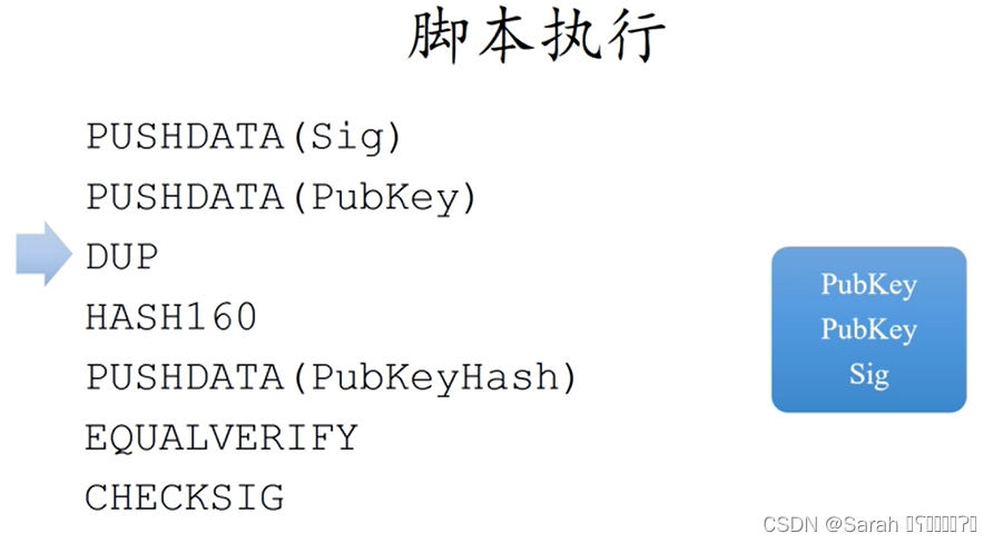 inputscript: % the inputscript is from the current transaction PUSHDATA(Sig) %给出(input)的 签名,该签名( privatekey) ,是对 (该input BTC 来源transaction) 整个交易的签名;  下图为 这种 脚本的 执行情况: 在实际的code中,inputscript 和 outputscript 是分别来执行的,为方便起见,本PPT中 将 inputscript 和 outputscript 放在一起执行: PUSHDATA(Sig) %来源于 inputscript,意为:将 signature 压入 栈; PUSHDATA(PubKey) %来源于outputscript,意为:将output publickey 压入 栈; CHECKSIG %将上述两条data从栈中弹出,如果 publickey 与 signature 匹配,则 验证通过,or else,verification不通过,the transaction is illegal。  下图为 Pay to PublicKey 的一个实例: the 1st line number in blue colour 为 current transaction id; inputscripts :from current transaction ,该script给出了 input 的 signature,执行语句为:ScriptSig:PUSHDATA(71); the 2nd line number in blue colour 为 previous transaction id; outputscript:from previous transaction,该script 有 2条 语句: PUSHDATA(PubKey) %给出了 the output of previous transaction 的 Publickey; CHECKSIG %verify the signature given by intputscript  type 二:P2PKH (Pay to PublicKey Hash),为 最常用的一种脚本形式,如下图所示: P2PKH 与 P2PK 的 区别在于,P2PKH outputscript 给出的是 public key hash 而非 public key。output of previous transaction 的 public key 是在 inputscripts 中给出的。outputscript中的 语句 DUP; HASH160; 均用于验证 inputscript 中 signature 的正确性。  下图为P2PKH的脚本执行情况: