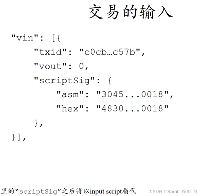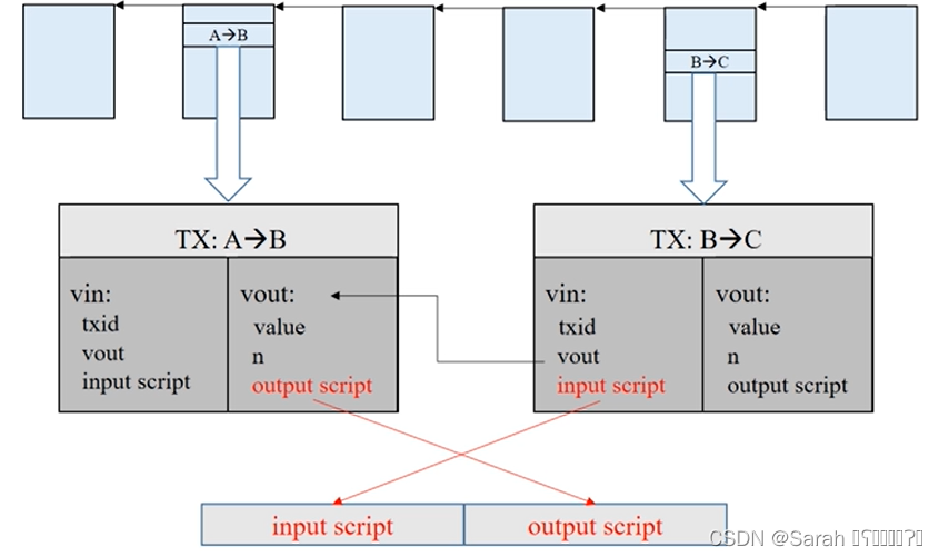下图为该交易的一些 宏观内容,各个 variable 代表的内容如下: txid:transaction id; hash:H(transaction); version:the version of BTC agreement; size: the size of transaction; locktime:交易的生效时间 (the tansaction comes into effect imediately:the locktime of most of transactions = 0 some special transactions may not equal to 0); “vin” , “vout” 为 输入输出的一些info;(后续给出具体内容); blockhash:该交易所在block的 哈希值; confrimations:该交易 已有 how many confirmations; time:该交易产生的时间(从交易产生到 现在 过了多少秒); blocktime:该block产生的时间(从 block 产生到现在,过了多少秒);  以下为 " vin " 的具体内容: txid 为 input来源交易的id号; vout 表示 input 为 其 来源交易 的 第几个output; scriptsig:为 input script,一般来讲,每个交易的input 只要给出 其BTC来源 和 signature 即可。如果交易有多个input,则需给出多个signature。  以下为 " vout " 的内容: value:为转出的 BTC 金额,如果用BTC的最小单位 ”葱“ 来表示 转账金额的话,其为: 2268万4葱; n:代表 该 output 为交易中的 第几个 output; scriptPubkey:为 output script,在一个transaction中,outputscript至少要给出其publickey; reqsigs:指 该交易 中 需要多少个 signature 才能兑现,在该交易中,仅需一个 signature即可; type:为输出的类型,该交易中为 ”publickey 的 hash“; addresses:为 output的地址;  下图展示了一个 交易 的 输出过程: 图上方一系列 linked block为一个小型的 block chain,在该blockchain中有2个transaction,A->B,B->C,期间隔了2个block。从图中可以看出,the 2nd transaction 的 input 为 the 1st transaction 的 output,the 2nd 交易结构 中的 vout 指向 the 1st 交易结构 中的 output,要验证 the 2nd 交易 的 合法性,只需 将 the inputscript of 2nd transaction attached to the outputscript of the 1st transaction,then run the script,如果堆栈 返回 为 非0 值,即表明该transaction合法,否则,非法。在最初的BTC system中,the verification of transaction 会将 脚本拼接起来后,执行一遍,之后,为了improve the safty of BTC system,verification 会将 the inputscript of 2nd transaction 和 the outputscript of 1st transaction 分别执行。 如果一个交易 有 多个 input,则每个inputscript都需要和对应的outputscript 拼接执行,only if 所有 拼接脚本 执行通过时,才认为该交易为合法交易。  下面介绍 inputscript && outputscript 的几种type: type 一(the simplest one) :P2PK(pay to public key),如下图所示: outputscript : % the outputscript is from the previous transaction PUSHDATA(PubKey) % 直接给出 收款人的Publickey CHECKSIG % 确认签名(input)的操作