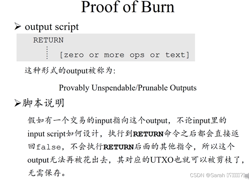 Proof of Burn 的 outputscripts 中,有一个 return 语句,在return 语句 下方,可以 编写anything。 Proof of Burn 的 outputscripts 在执行到 return 时,便会自动 报错返回,因此,写在 return 后面 的 writing 可被 永久保存到 账本,而无需担心 writing 被篡改。 Proof of Burn主要有2个应用场景: 1)一些小的 数字加密货币,要求 用户 销毁 一定数量的BTC 才可获得 其 digital coin(这个coin也被称为 Alternative coin)。此时,用户 可以 采用 Proof of Burn 的方式,销毁BTC,举例说明: clients -> Alt coin,在这个transaction中,clients 利用 Proof of Burn 编写 outputscript of current transaction,这样 BTC given by clients 就会被 fix 到 current transaction,由于outputscript 采用 Proof of Burn script,因此,即便 Alt coin 产生某一交易:Alt coin -> C,在进行 交易合法性 验证,运行 拼接脚本 [inputscript of next transaction(written by Alt coin) , outputscript of previous transaction(written by clients)] 时,when run “return”,BTC system 会报错,交易验证失败,该BTC 无法被spend。 2) 可以利用 Proof of Burn script 的特性,将需要永久保存的 一些 内容 取 hash 后 ,将 hash值 编写 到 outputscript return 之后。 如:clients 可 生成交易 :client -> clientself,以 Proof of Burn script 的方式,将 某知识产权内容 取hash 后,把hash值写在 outputscript 的 return 之后,这样 该hash值 即可 永久保存在 blockchain 中。当发生 知识产权 纠纷 时,clients 可以将 知识产权内容 取 hash,与该transaction中 outputscript return 语句后的 hash值 做对比,据此,可以证明,clients在 某个时间节点之前 ,已经 知道 知识产权的内容。