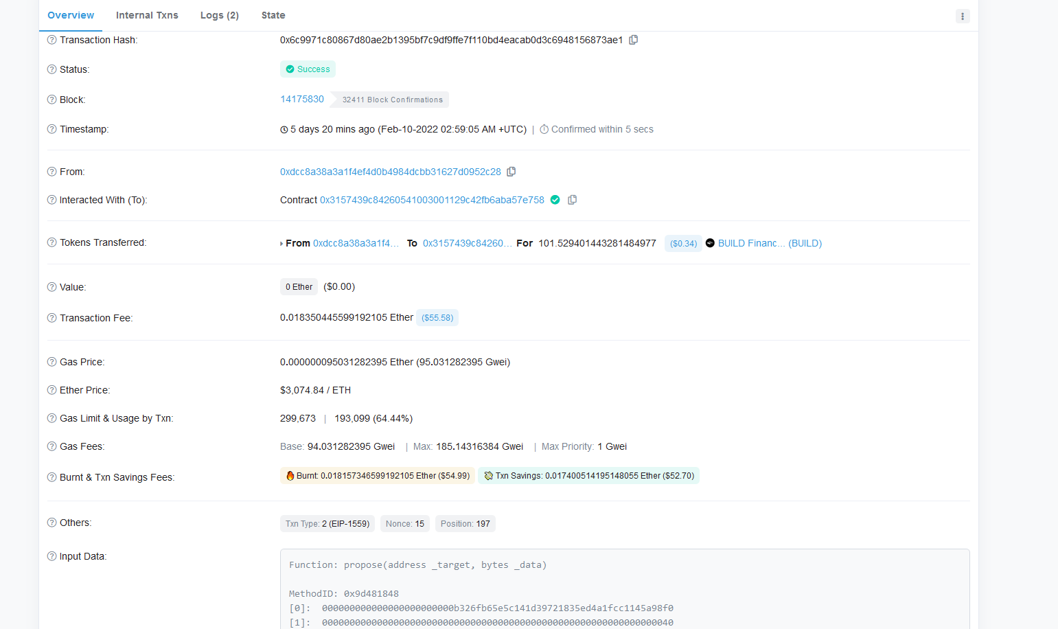 该函数方法允许任何拥有一定数量资产的用户发起提案,持有该资产的其他用户进行投票,函数代码未发现安全问题,因此我们推测攻击者可能是通过合约发起的提案。在提案通过后,攻击者铸造了100万个BUILD代币,耗尽大部分Balancer和Uniswap流动性池的资金: