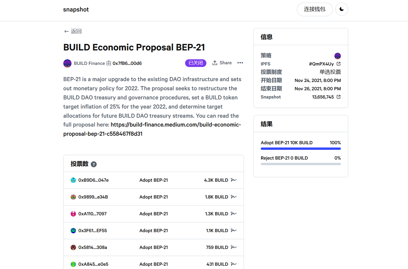该合约线上提案投票地址 https://snapshot.org/#/build ,最近的提案在2021年11月24号,而参与线上提案的钱包地址未发现与治理合约有交互,推测线上的提案不直接上链和合约交互: