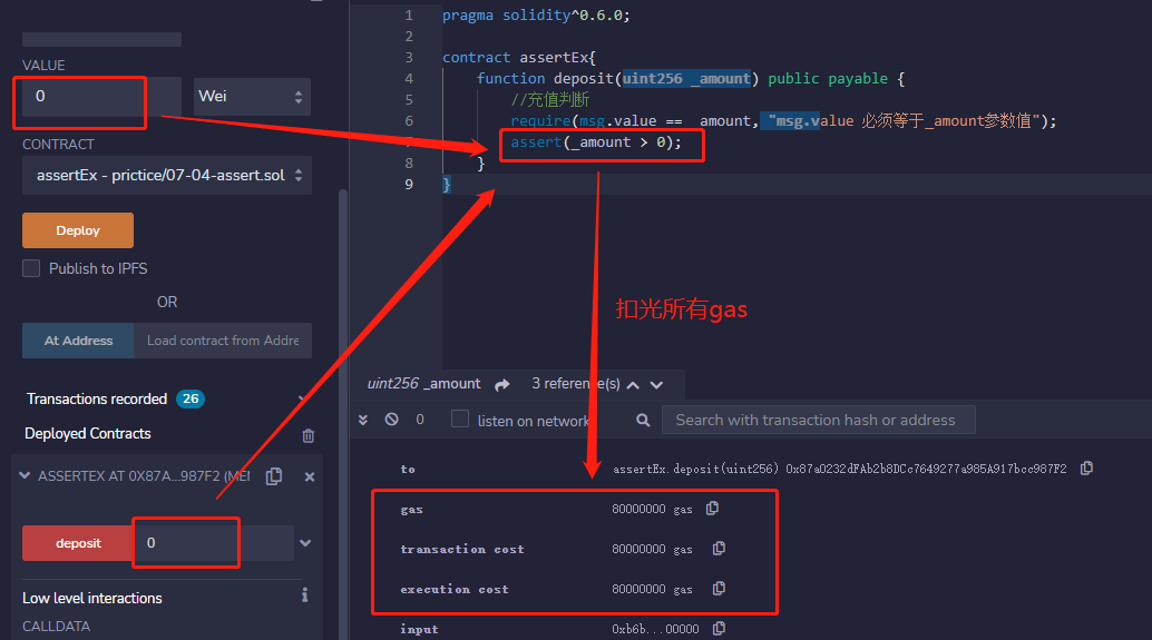 对用户惩罚,扣光所有gas。用于内部变量判断,pure函数或检测系统错误。