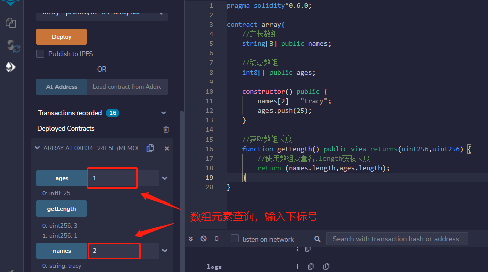 | T[N] | 定长数组,N为数组长度 | | T[] | 动态数组,使用push推入 | | struct | 结构体 | | mapping(T1=>T2) | 映射表 | | bytesN | 字节数组,N为1~32整数 |