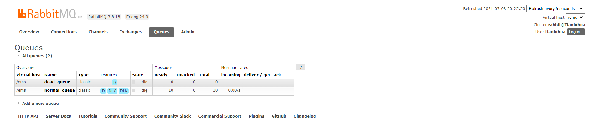 运行生产者和死信消费者,我们在RabbitMQ服务器后台能看到在普通队列里有10条消息积压