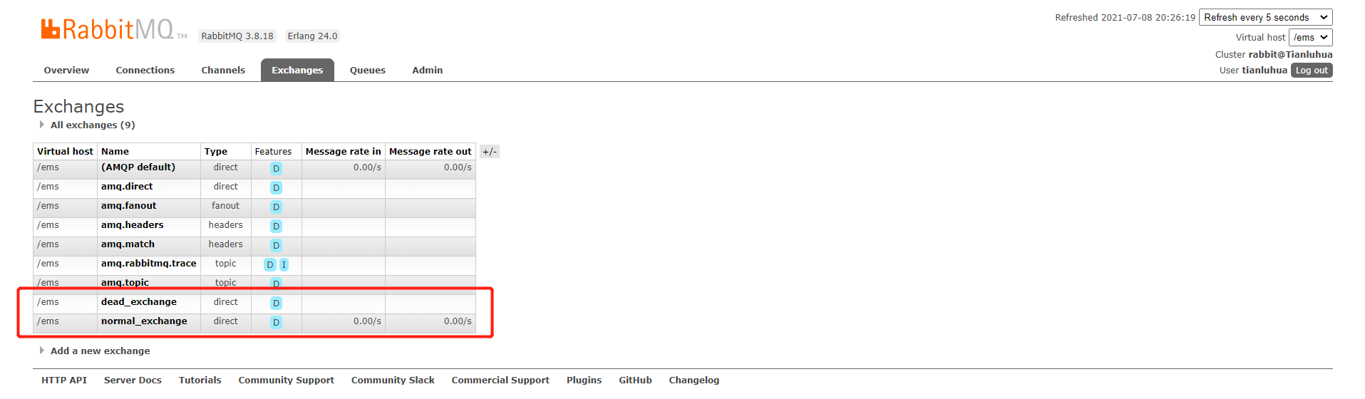 将生产者运行起来,我们在RabbitMQ的服务器上就能看到我们创建的普通交换机、普通队列(和死信交换机的绑定关系)、死信队列、死信交换机等等。
