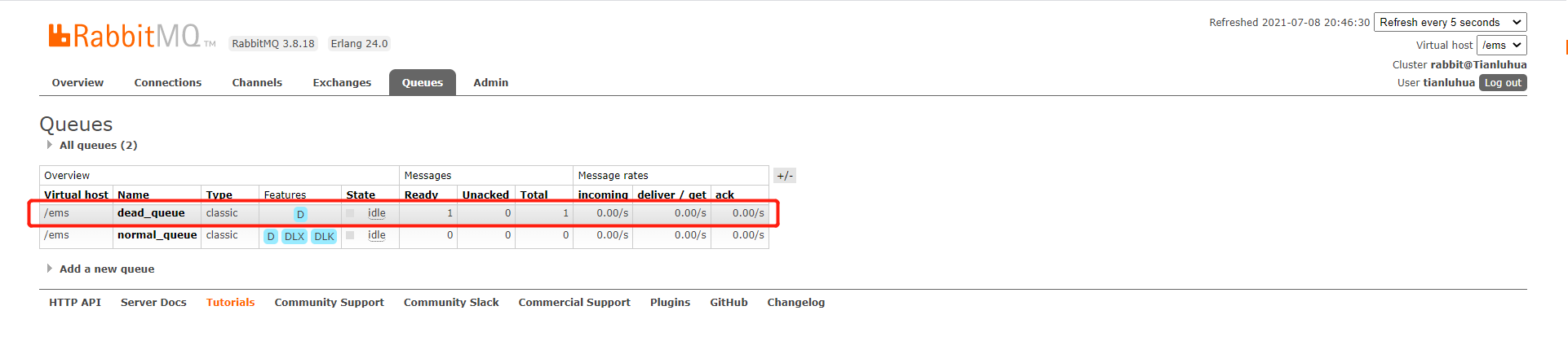 普通队列【途中看到的DLX和DLK用鼠标放上去,就能显示它绑定死信交换机和死信队列的routtingKey】和死信队列