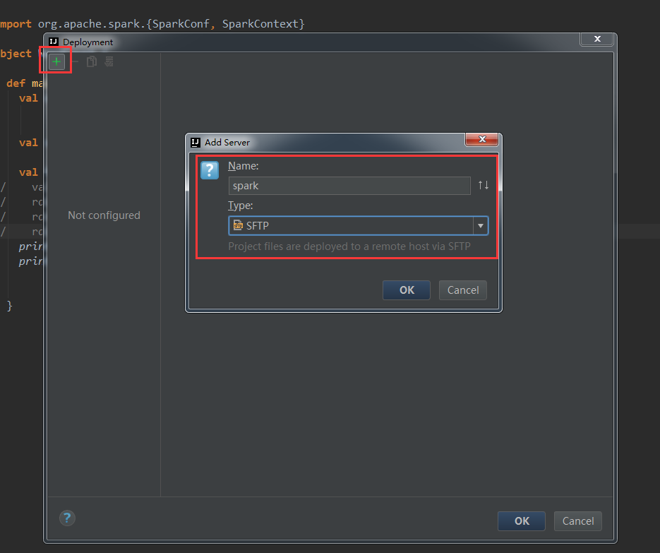 配置远程部署路径Scala文件最终会被打包成jar文件,然后使用spark-submit工具提交到spark主节点执行任务。由于spark-submit工具在远程服务器,所以需要配置jar包到远程服务器的部署,如下: idea Tools->deployment->configuration,弹出deployment窗口,点击+号,按下图选择Type,name自定义: 配置connection: