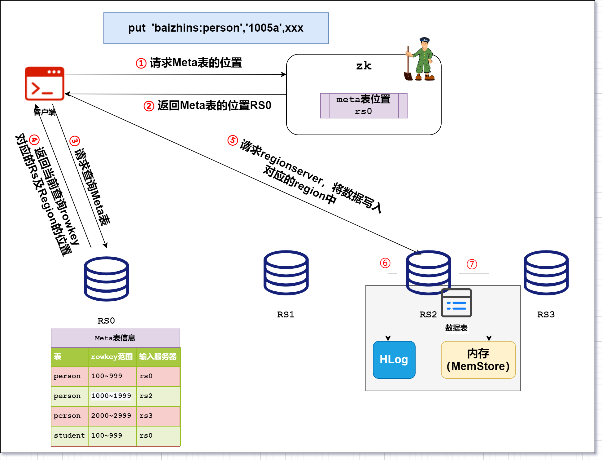 获取写数据的region所在的RegionServer,然后先将数据写到WAL(Write-Ahead Logging,预写日志系统)中,然后再将数据写到Memstore等待刷新,回复客户端写完成,然后再写入到storefile