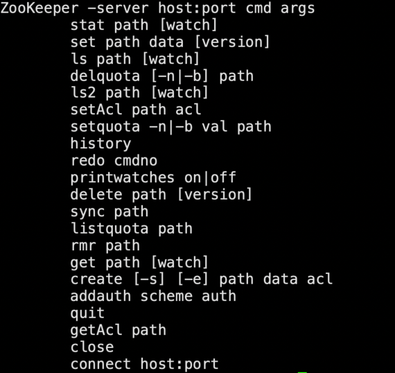 连接成功之后,系统会输出Zookeeper的相关环境及配置信息等信息。输?help之后,屏幕会输出可?的Zookeeper命令,如下图所示  创建节点 使?create命令,可以创建?个Zookeeper节点, 如