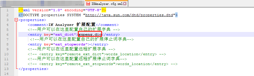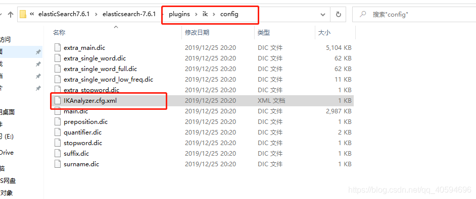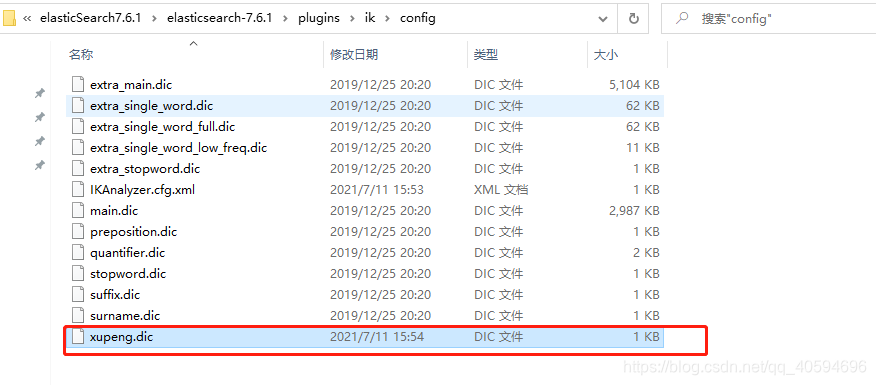 .进入es的plugins,找到IKAnalyzer.cfg.xml文件: