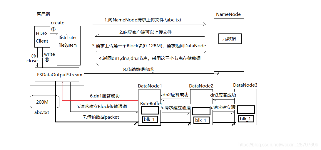 ?????????????????具体流程: ?? ??? ??? ??? ?①客户端通过Distributed FileSystem模块向NameNode请求上传文件,NameNode收到请求后会进行校验:①校验是否有写权限②校验路径下是否有同名文件 ?? ??? ??? ??? ?②NameNode返回是否可以上传(如果校验失败,会直接报错。如果成功会给客户端返回一个信号,表示可以上传) ?? ??? ??? ??? ?③客户端请求第一个Block块上传到哪几个DataNode节点上。 ?? ??? ??? ??? ?④NameNode返回3个DataNode节点,dn1,dn2,dn3 ?? ??? ??? ??? ?⑤客户端通过FSDataOutputStream模块请求dn1上传数据,dn1收到请求会继续调用dn2,然后dn2调用dn3,将这个通信管道建立完成。 ?? ??? ??? ??? ?⑥dn1、dn2、dn3逐级应答客户端。 ?? ??? ??? ??? ?⑦客户端开始往dn1上传第一个Block(先从磁盘读取数据放到一个本地内存缓存),以Packet为单位,dn1收到一个Packet就会传给dn2,dn2传给dn3;dn1每传一个packet会放入一个应答队列等待应答。 ?? ??? ??? ??? ?⑧当一个Block传输完成之后,客户端再次请求NameNode上传第二个Block的服务器。(重复执行3-7步)。