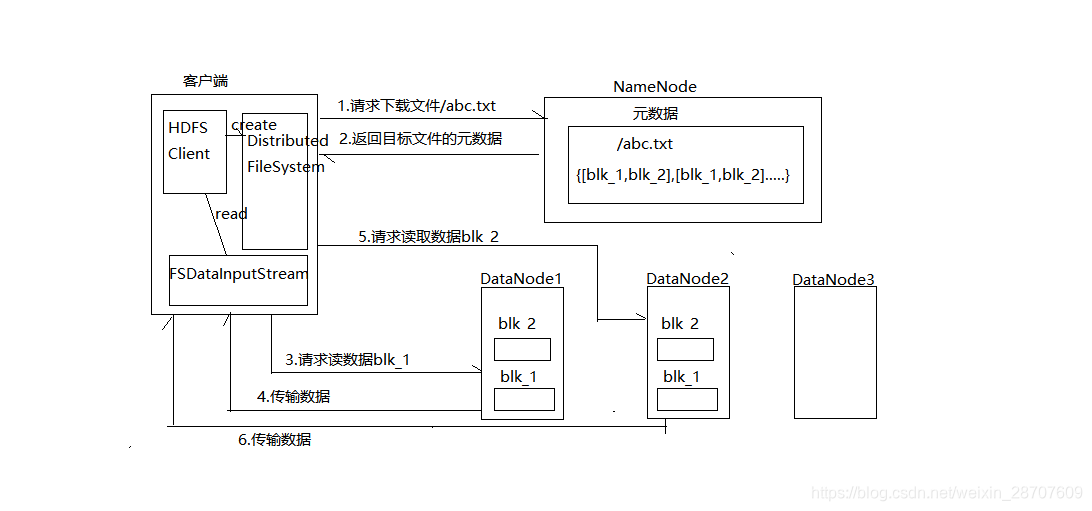 ?????????????????具体流程: ?? ??? ??? ?????????①客户端通过Distributed FileSystem向NameNode请求下载文件,NameNode通过查询元数据信息,获取文件块所在的DataNode节点地址 ?? ??? ??? ?????????②挑选一台DataNode服务器(就近原则),请求读取数据 ?? ??? ??? ?????????③DataNode开始传输数据给客户端(从磁盘里读取 数据输入流,以Packet为单位来做校验) ?? ??? ??? ?????????④客户端以Packet为单位接受,先在本地缓存,然后写入目标文件