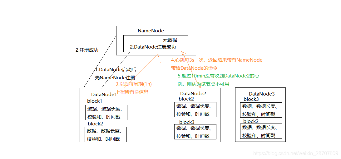 ? ? ? ? ? ? (1)一个数据块在DataNode上以文件形式存储在磁盘上,包括两个文件,一个是数据本身,一个是元数据包括数据块的长度,块数据的校验和,以及时间戳 ?? ??? ??? ?(2)DataNode启动后向NameNode注册,通过后,周期性(1小时)的向NameNode上报所有的块信息 ?? ??? ??? ?(3)心跳是每3秒一次,心跳返回结果带有NameNode给该DataNode的命令如复制块数据到另一台机器,或删除某个数据块。如果超过10分钟没有收到某个DataNode的心跳,则认为该节点不可用 ?? ??? ??? ?(4)集群运行中可以安全加入和退出一些机器