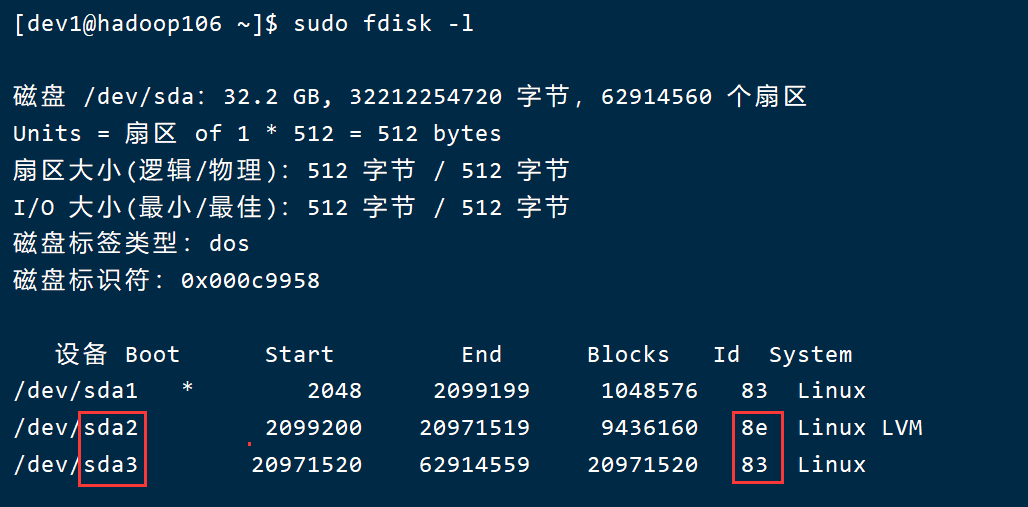 通过执行命令:fdisk -l发现sda3的id是83,我们需要将sda3的id的system改成和sda2一样