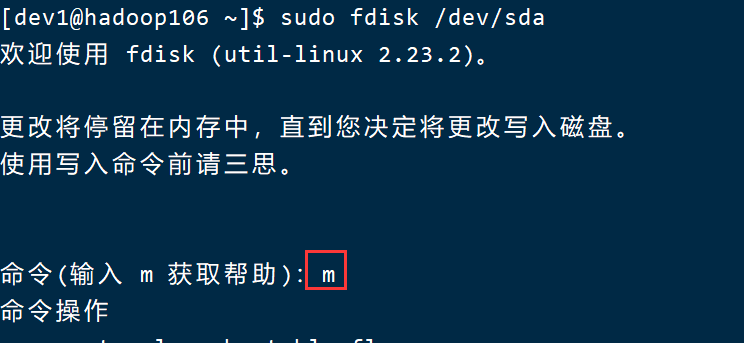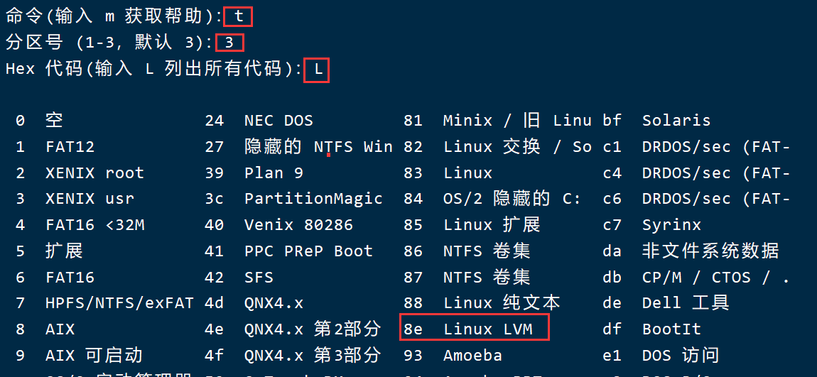 运行命令:fdisk /dev/sda,执行参数: t->3->L->8e->w